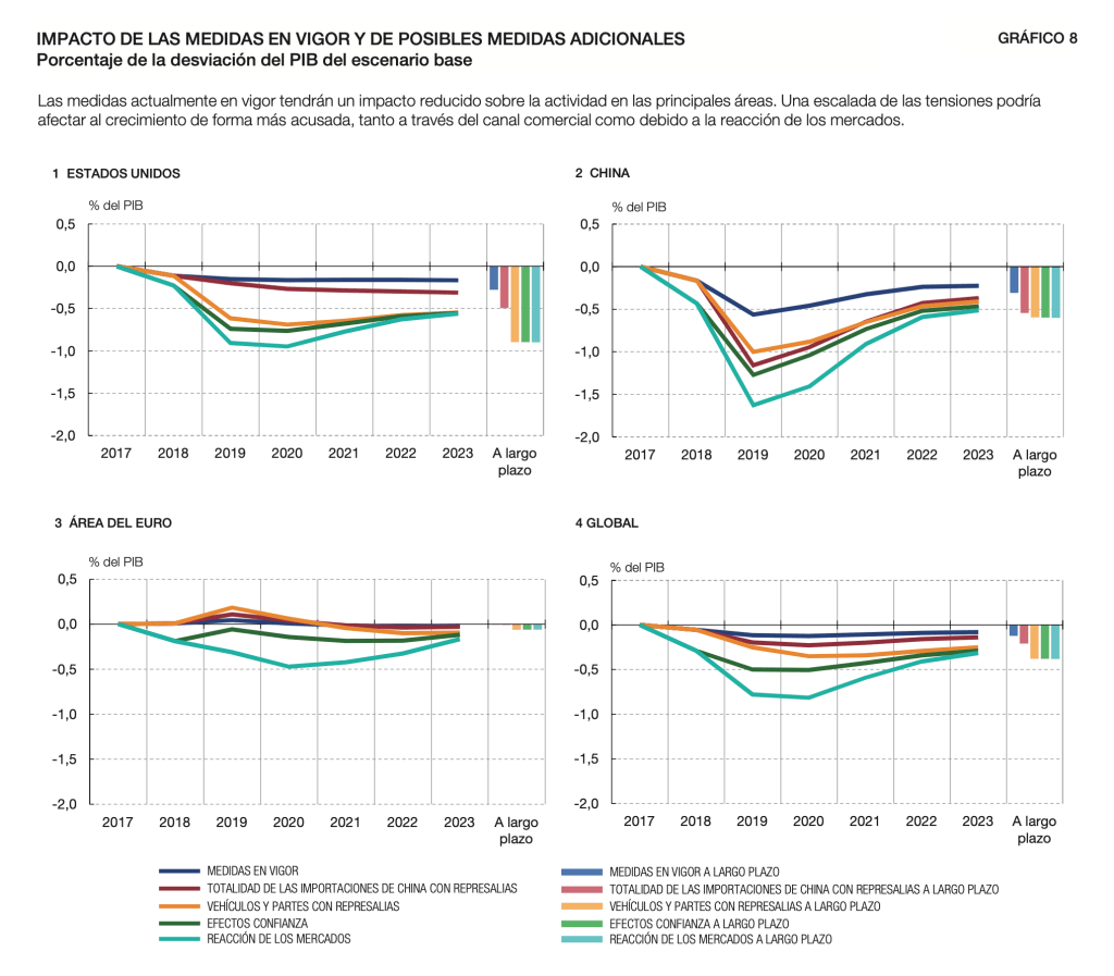 Por fortuna, señala el Banco de España que el área del euro no es, en principio, el foco principal de la política proteccionista comercial desarrollada por la Administración Trump, más centrada en China, ni se verá fuertemente afectada por las medidas aprobadas o, incluso, por las anunciadas hasta ahora. No obstante, el impacto de dichas medidas podría intensificarse si vinieran acompañadas de efectos sobre la incertidumbre y la confianza más acentuados. Por otra parte, la posible imposición de barreras arancelarias al sector del automóvil por parte de Estados Unidos podría tener efectos más adversos de los previstos a través de las cadenas de valor europeas y, en cualquier caso, afectaría severamente a algunos países del área.