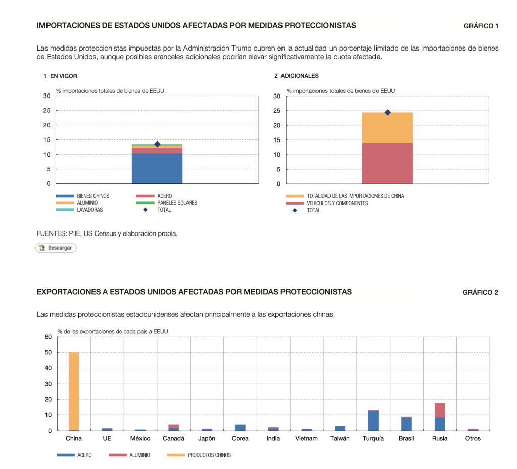 Según ha informado el Instituto de Comercio Exterior, (ICEX), las medidas proteccionistas adoptadas por EE. UU. han afectado directamente al comercio de la UE solo de manera marginal aún. No obstante, la imposición de aranceles adicionales del 25% elevaría al 14,7% la proporción de exportaciones totales de la UE a EE. UU. afectadas por medidas proteccionistas. Aunque estas medidas tendrían un impacto reducido sobre el PIB agregado de la UE, afectarían de manera más acusada al sector del automóvil, y a aquellos países cuyas exportaciones representan un porcentaje elevado sobre el total del sector, como es el caso del Reino Unido (20%), Italia (15,8%) y Alemania (12,8%). En concreto, los aranceles adicionales podrían desencadenar una disminución de un 0,2% del PIB en Alemania, y de en torno a un 0,1% en el Reino Unido e Italia.